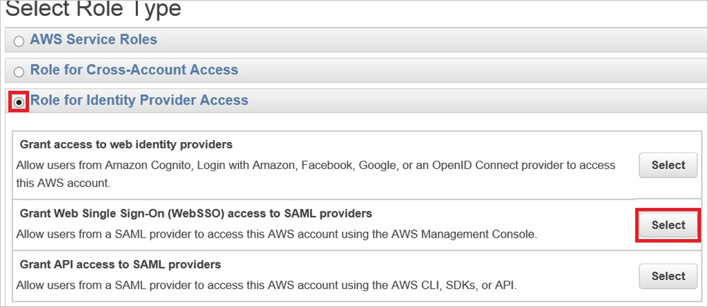 b. 在授予 SAML 提供程序的 Web 单一访问 (WebSSO) 访问权限部分中,单击“选择”。