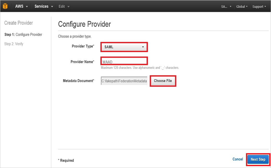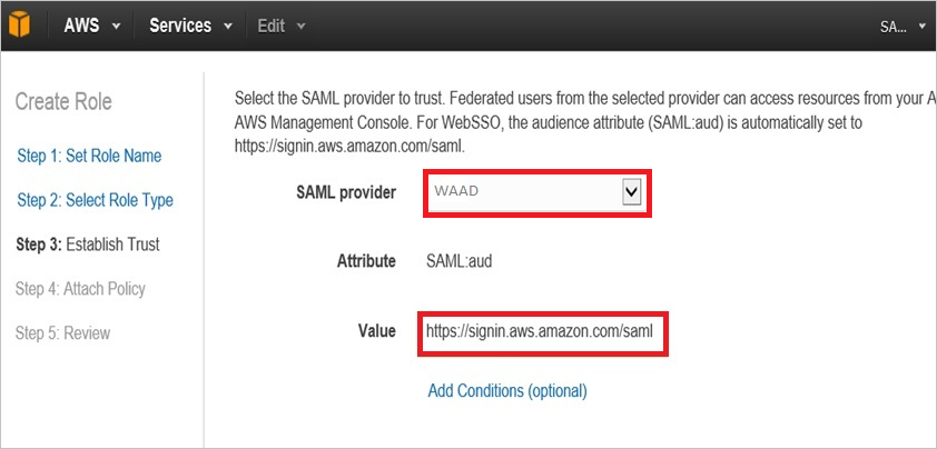 a. 对于 SAML 提供者,选择之前创建的 SAML 提供者(例如:WAAD)