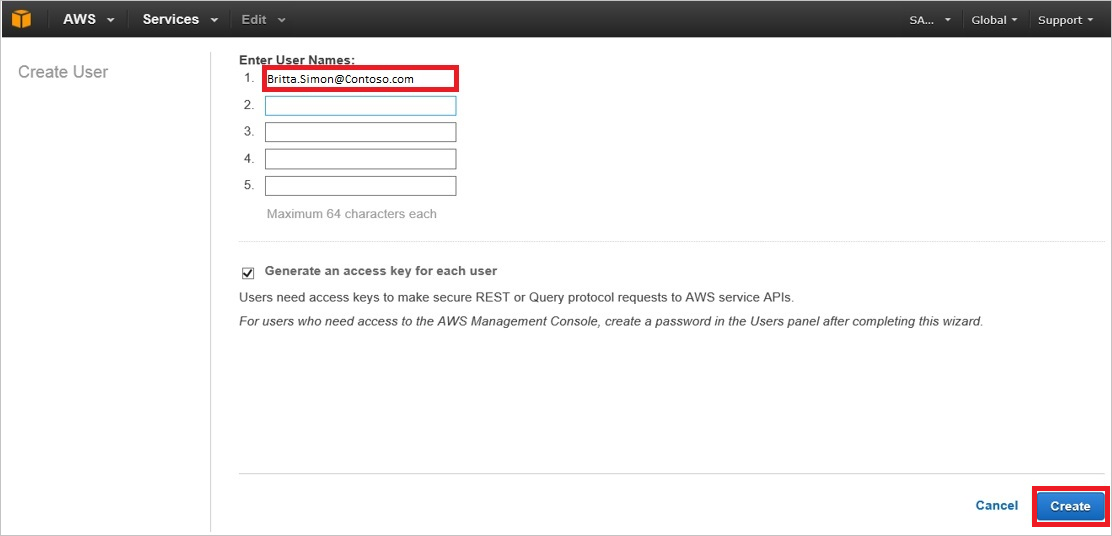 - 创建 Amazon Web Services 测试用户 – 在 Amazon Web Services (AWS) 中创建 Britta Simon 的对应用户,并将其链接到该用户的 Azure AD 表示形式。