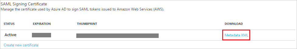 - 在“SAML 签名证书”部分中,单击“元数据 XML”,并在计算机上保存 XML 文件。