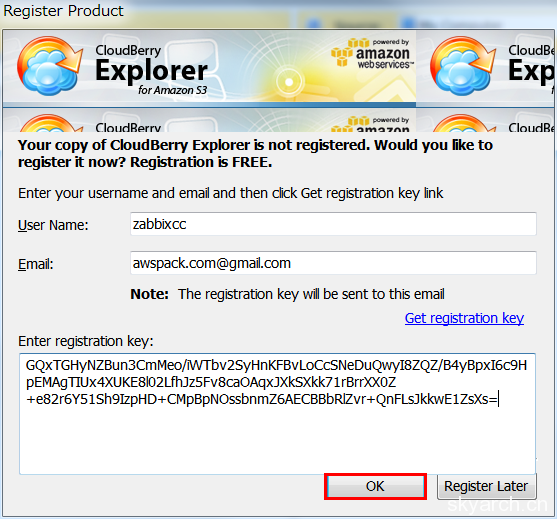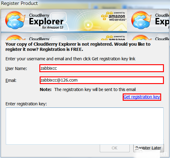 2-1 「User Name」填写任意的名字,「Email」必须填写有效的邮箱地址,然后点击「Get registration key」
