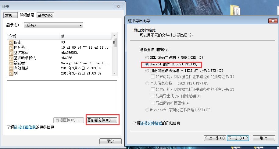 可以看到证书需要pem格式的证书,而证书包里面给的类型是crt的,下面就是怎样导出pem格式证书的方法啦!