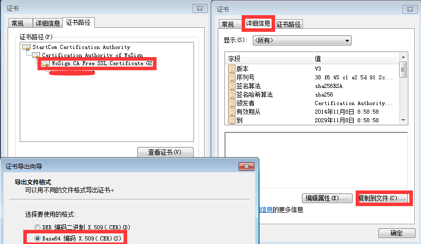 然后回到证书路径里面,选择上一级证书,导出并命名为2