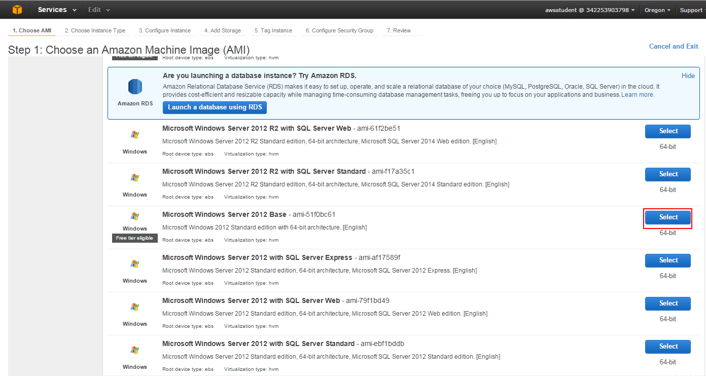 3.选择自己所需的Windows镜像,这里选择「Microsoft Windows Server 2012 Base- ami-51f0bc61」。