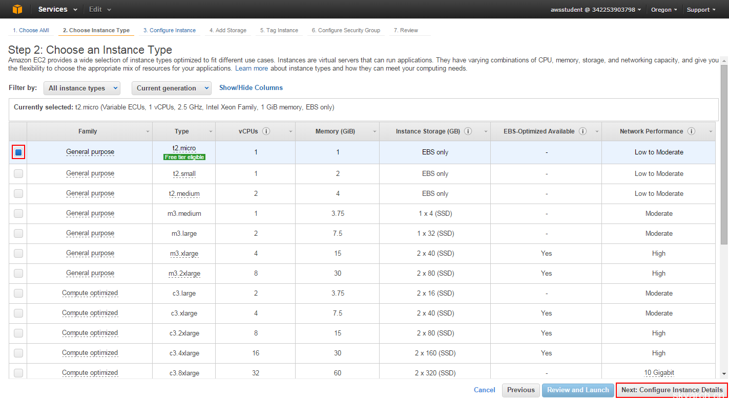 4.选择所需的实例类型,这是决定实例性能的关键一步,这里选择t2.micro。点击「next:Configure Instance Details 」进行下一步。