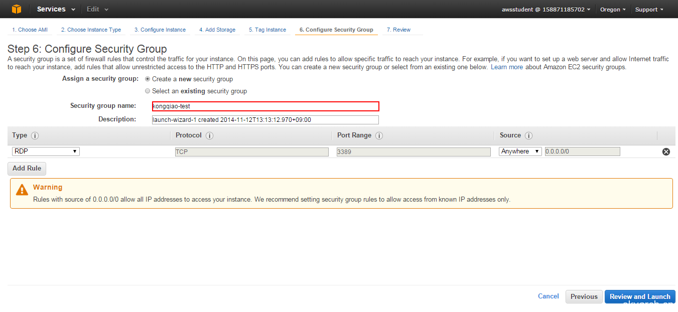 8. 这里很重要,选择「Create a New Security Group」,填写合适的安全组名字。这里为「yunwei123-test」, 而且下面设有默认的「RDP 0.0.0.0/0」安全组,也就是说,不管是谁只要知道该实例的IP,账户,密码都可以登陆。如果设定特定IP登陆的话, 在Source Anyware的地方,可改为Costume IP,仅仅允许特定的IP进行登陆(以后也可以变更),之后选择「Review Launch」进行下一步。