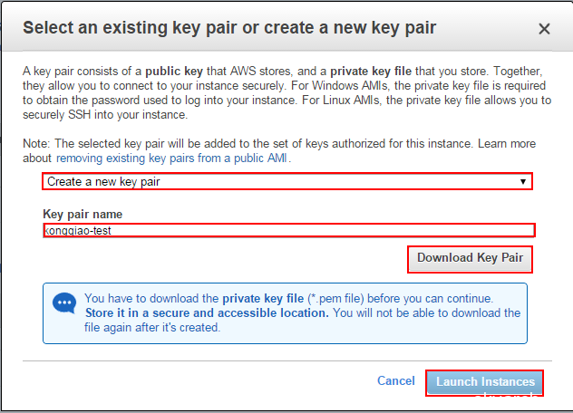 10.创建生成密码用的密钥,选择「Create a New key pair」创建密钥,这里为「yunwei123-test」,点击「Down load key pair」,名字为「yunwei123-test.pem」的文件被下载到本地。然后点击「Launch Instances」进行下一步。