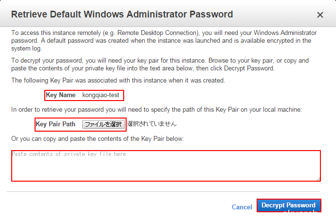 13. Key Name的地方会显示自己创建的Key名称。点击「Key Pair Path」选择自己创建的Key,也可以复制Key的内容到下面空白处。点击「Decrypt Password」。