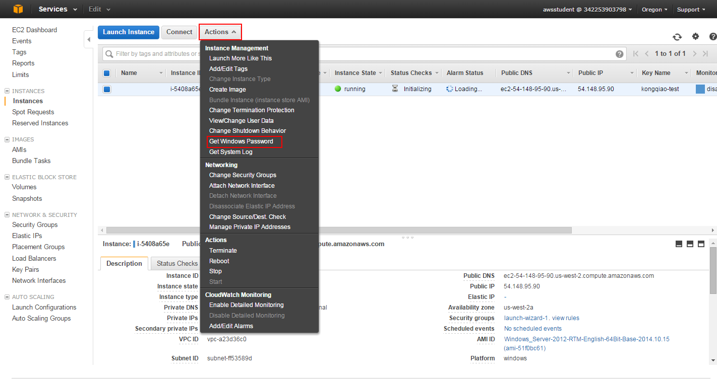 12.新的实例创建完成,画面下半部分是详细信息。点击「Actions」,从菜单栏选择「Get Windows Password」,设置服务器登陆密码。