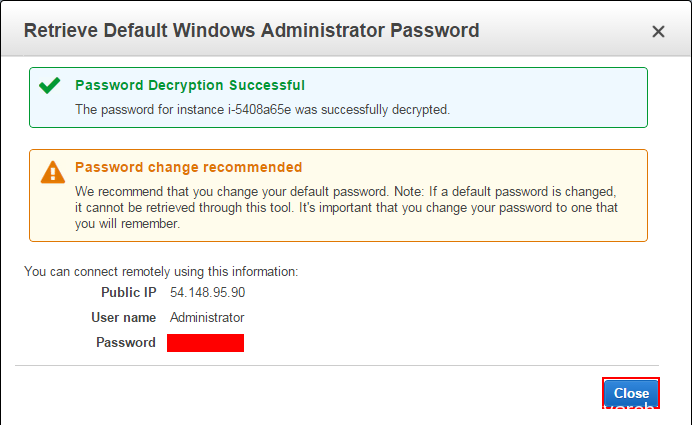 14.如下图:IP,用户名,密码都显示出来了。最好做笔记记住。然后点击「Close」。
