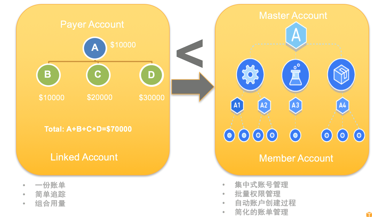- 组织内所有的AWS账户的资源被核算到统一的账单中并应用相关的阶梯价
