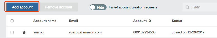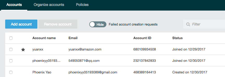 最后回到主账号下,可以看见包括Master Account,主动创建的Account以及受邀请加入的Account的信息