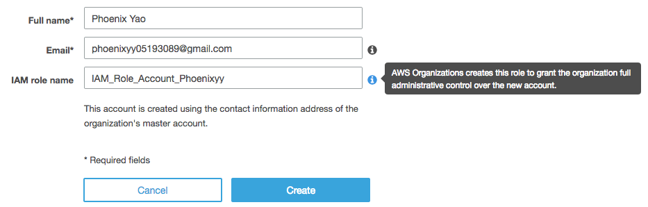 填写你希望添加的账号的全名和邮箱,并分配一个IAM Role,这个IAM Role是用来给予这个新Account一个full administrative control的权限。