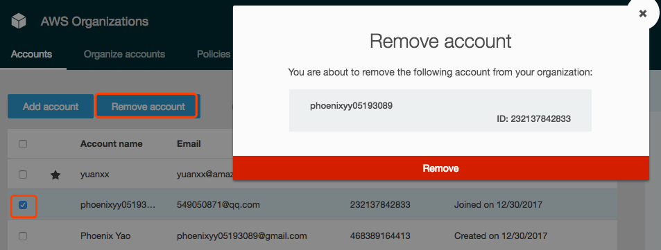 1. Master Account主动从Organization删除Account,点击单个或多个Account,点击删除即可