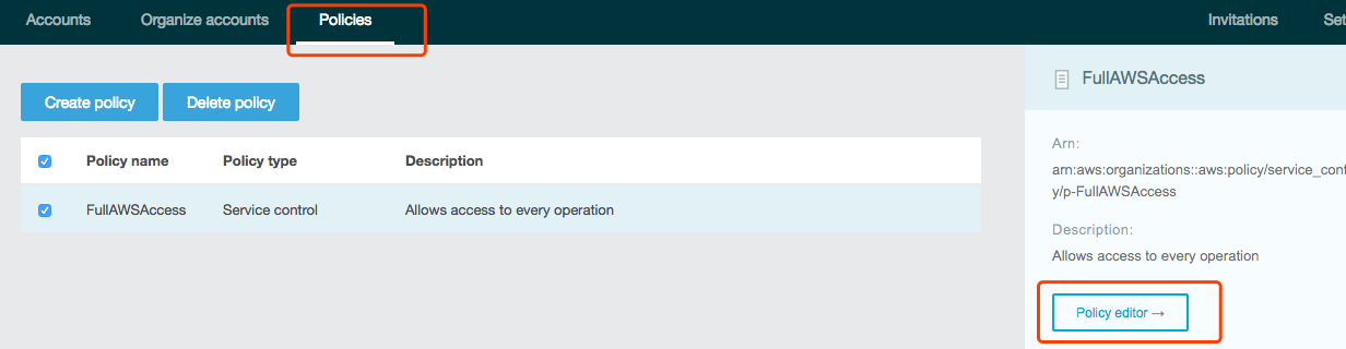 Service Control Policy在Policies下面可以进行设置,默认情况就有一个什么权限都有的FullAWSAccess Policy并且是attach到Root OU的。这也就意味着默认情况下,只有有Account加入这个Organization,那么这个Account就拥有操作所有AWS服务的权限。如果希望修改SCP,那么可以点击右侧的Policy editor进行修改