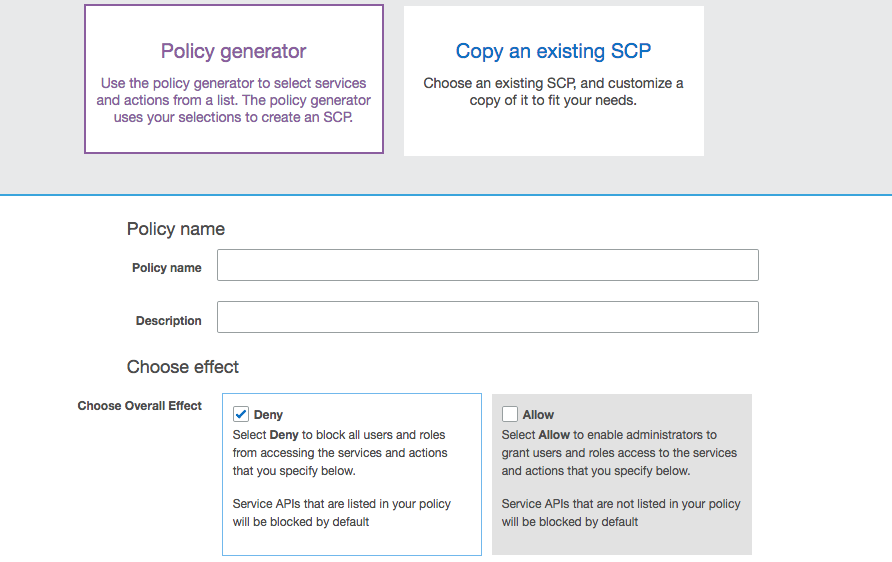 点击Policies界面下左上角的Create Policy可以从头创建一个SCP,你既可以选择使用Policy generator帮助你生成一个新的SCP,也可以从你已经创建的一个SCP中进行复制。在创建时,你可以选择白名单模式或者黑名单模式