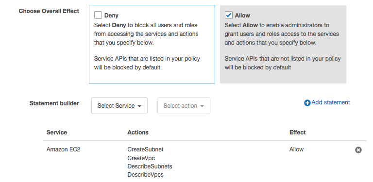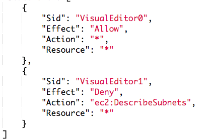 这里我选择白名单模式,创建一个名为“SCP_Allow_access_VPC_subnet”的SCP,仅允许Account创建和查看VPC和Subnet,其余动作都禁止