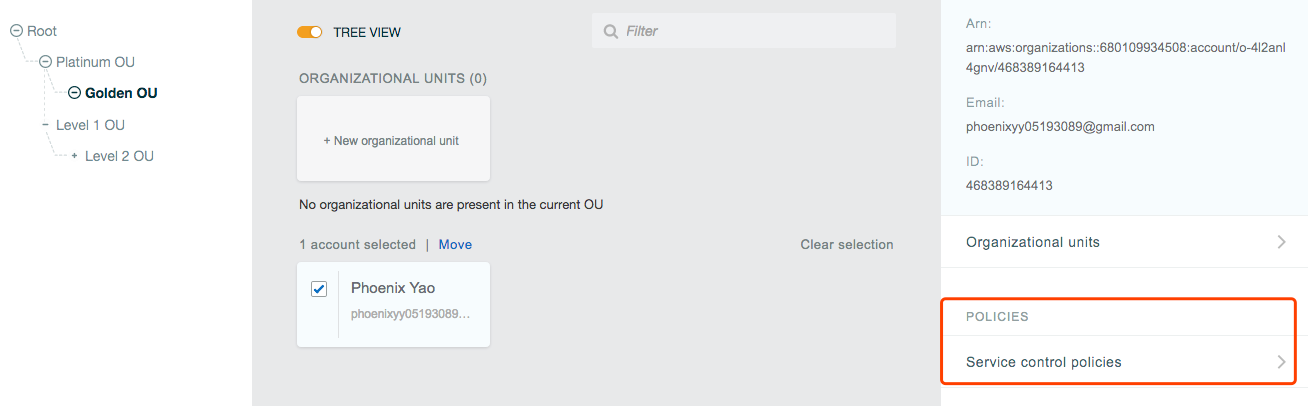所有的Account默认都在根OU下,你可以选择一个或者多个Account,并把他们移动到任意OU下。目前只能移动Account到OU,不能从OU主动加Account