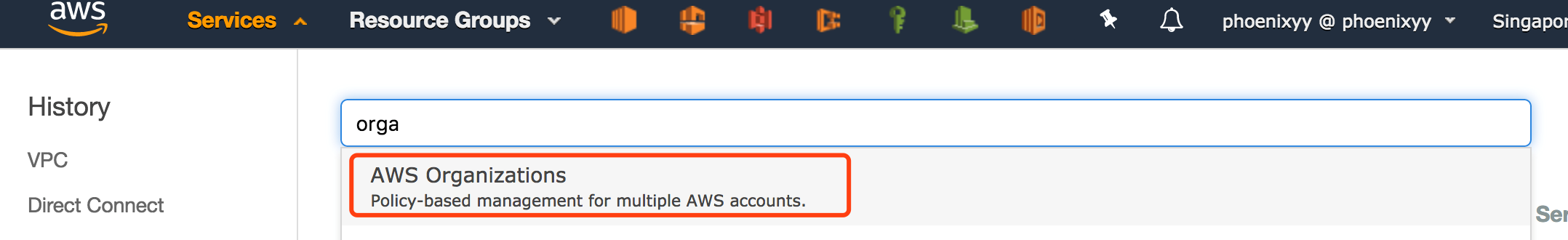 进入AWS Organizations服务的方式,可以通过在service上搜索的方式进入,或者通过在Account菜单下点击My Organization进入。在Service的下拉菜单中没有这项服务。