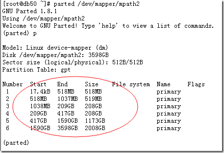 本例显示的磁盘阵列映射的设备名是mpath2,那么用dparted分区,就要在/dev/mapper/mpath2上进行了。分区后的结果如下