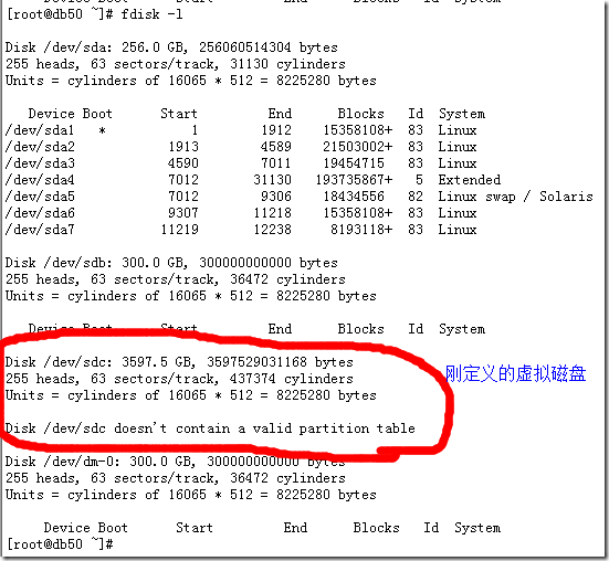 ◎检查rac节点服务器是否识别上述步骤创建的虚拟磁盘(每个节点都要检查,确保其正确性)。在主机上执行fdisk –l
