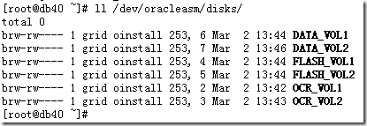 [root@db40 ~]# service oracleasm startInitializing the Oracle ASMLib driver: [ OK ]