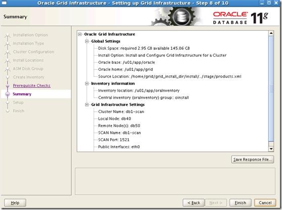到这里以后,一般不会出什么状况,只管点按钮“完成”进行文件的提取和安装,执行到一定程度后,需要以root帐号执行两个脚本/u01/app/oraInventory/orainstRoot.sh、/u01/app/grid/root.sh,后一个脚本很费时间,也容易出错。