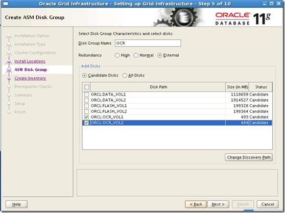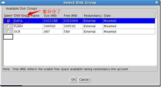 最好输入全路径,幸运的是,这里支持通配符.这里创建的磁盘组,是用来存储asm磁盘仲裁等信息。