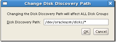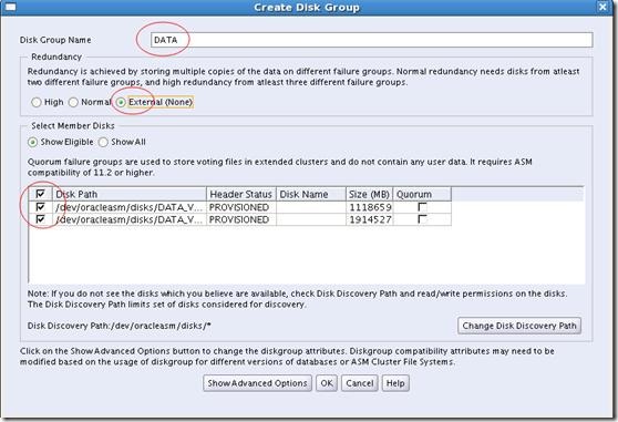 这些名字看着眼熟吧?就是前边oracleasm createdisk创建出来的。这里勾选2个项目,目的在于把他们合并成一个asm磁盘组。如果此处没有找到候选磁盘,则需点击按钮“Change Discovery Path”就,进行手工查找。
