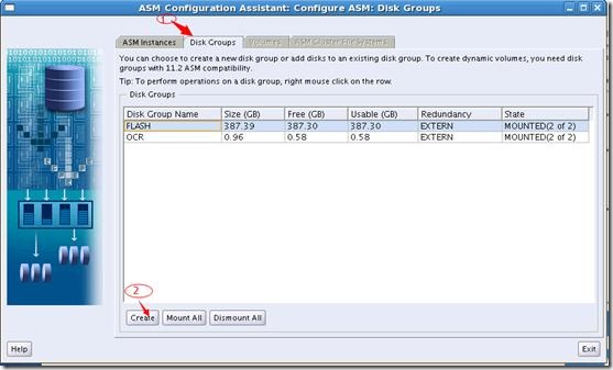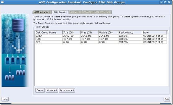 创建所需asm磁盘组(前边安装grid时,已经创建过一组了):grid用户执行asmca