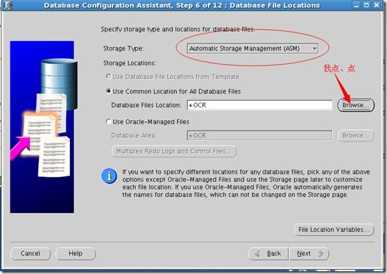 选择数据库文件存放的位置。当然要选ASM。如果不执行这个磁盘组创建过程,后面的数据库文件存放位置,如果选asm,将不能往下进行。